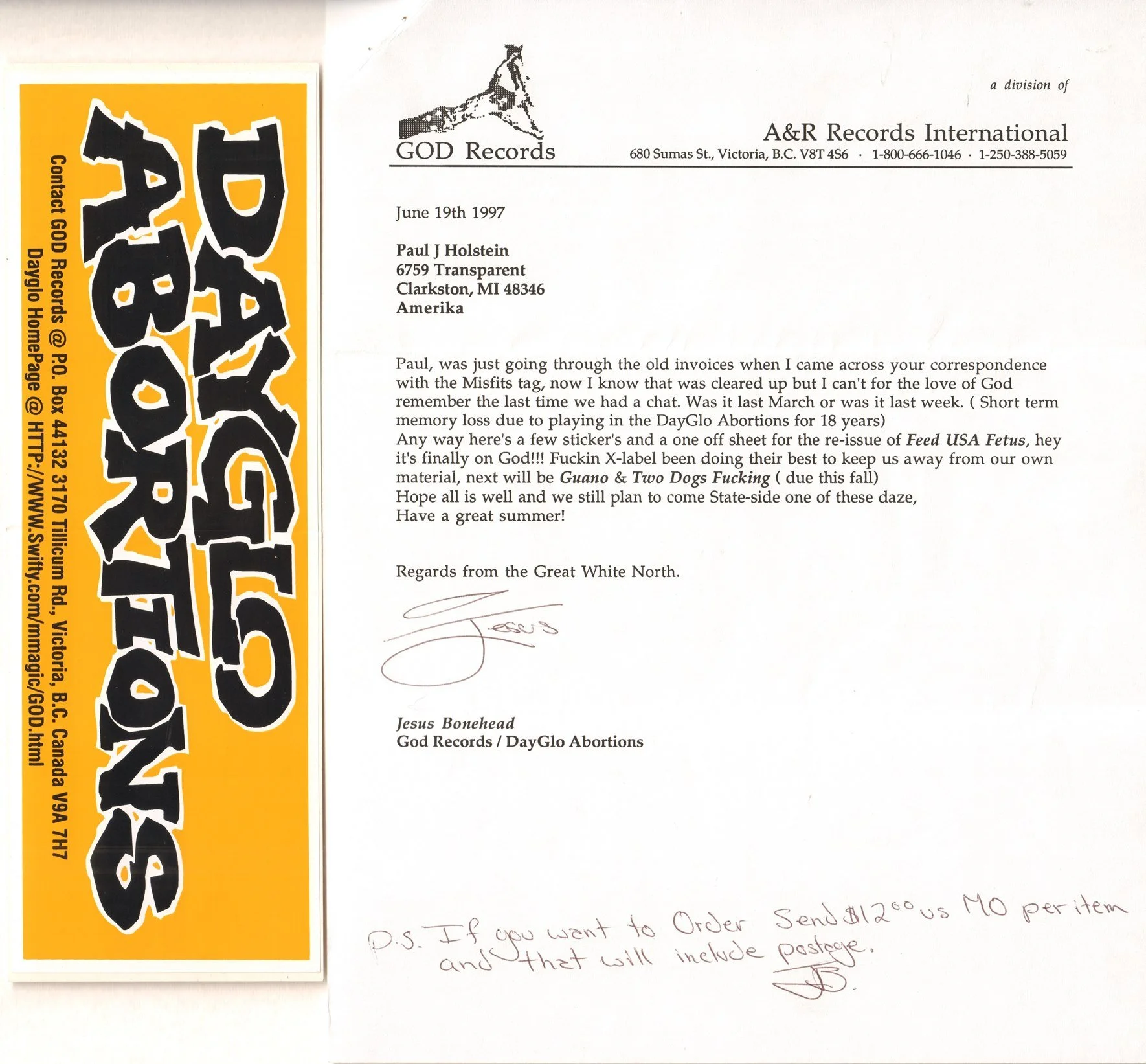 The 1980s were a great time for punk rock music; some may say that no decade afterward has been able to match it. I'm on the fence, with a lot of my favorite music coming out in the 1990s. This included four more releases by The Dayglos ("Two Dogs Fucking", "Little Man In The Canoe", "Corporate Whores", and "Death Race 2000"). These were all amazing albums, and cemented them as punk rock icons. While they never reached the level of commercial success that bands like The Misfits, The Dead Kennedys, and NOFX eventually did, their songs were just as good, and the lack of success seemed mostly intentional (which was fine with me). There was another show scheduled at Blondies that we showed up to, but The Dayglos did not (reportedly due to issues at the border), and that started a long drought for live Dayglos shows. In the mid-1990s, Dayglo’s drummer Jesus Bonehead started God Records to re-issue all of the Dayglo's material, and singer Cretin released (on God Records) an album with his side band Lummox. I corresponded through the mail with Jesus Bonehead a few times and ordered everything I needed to keep my Dayglos collection complete. At least the music was still coming out, and it was as good (and as offensive) as ever.