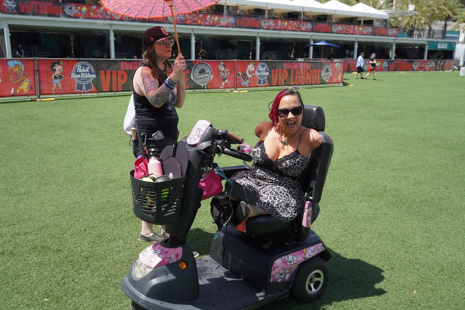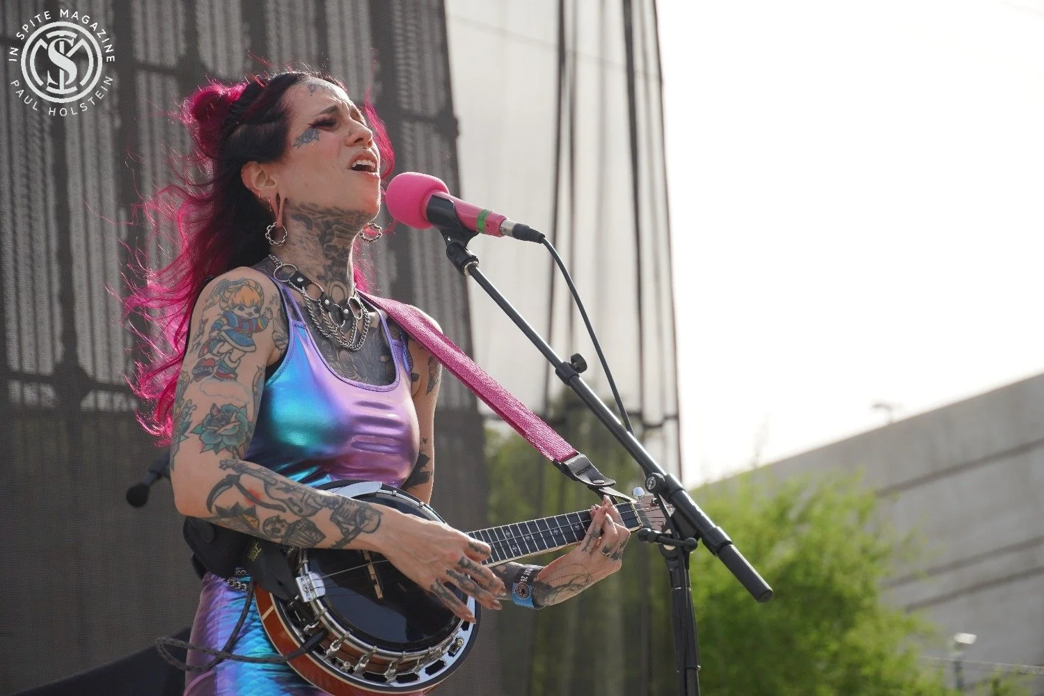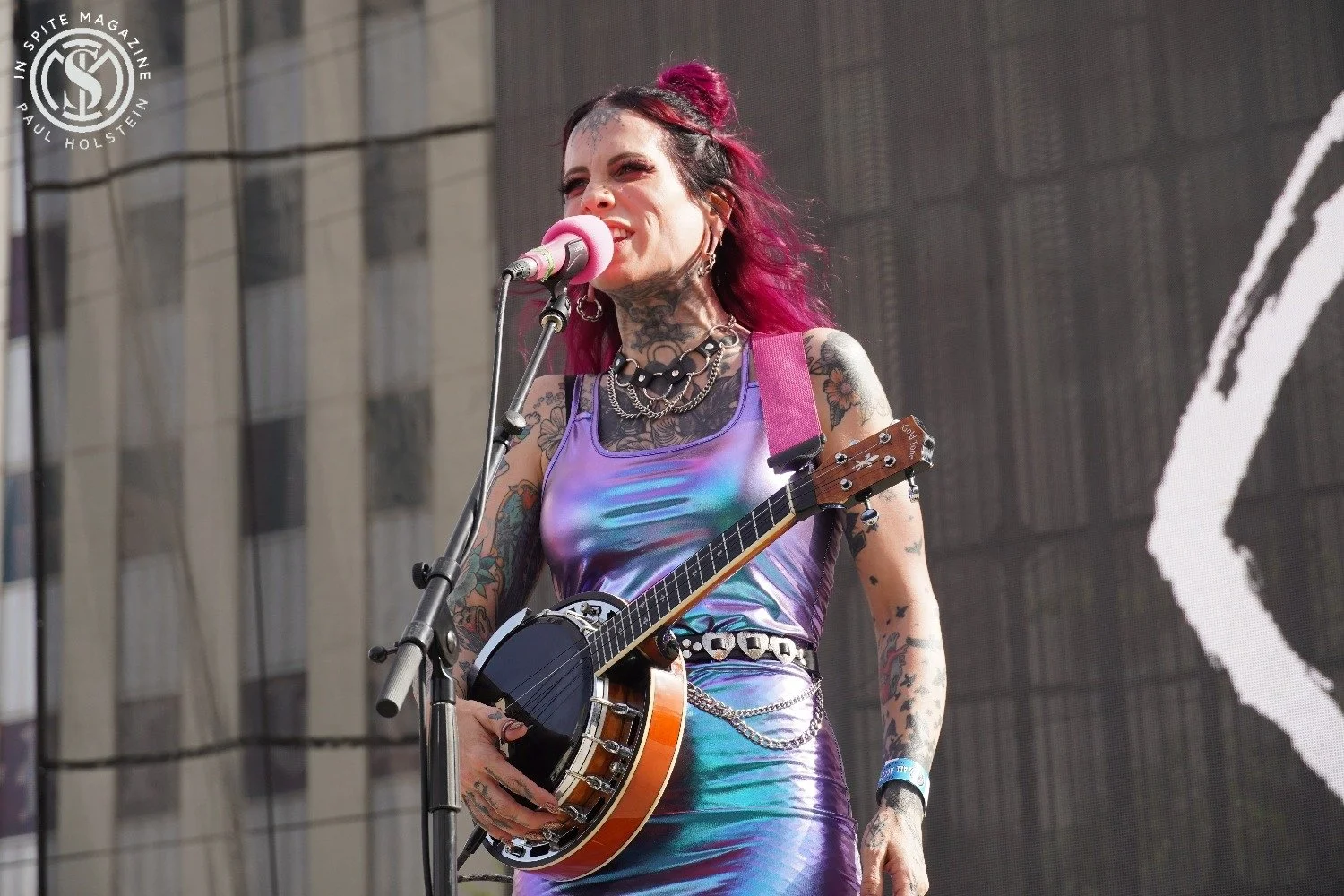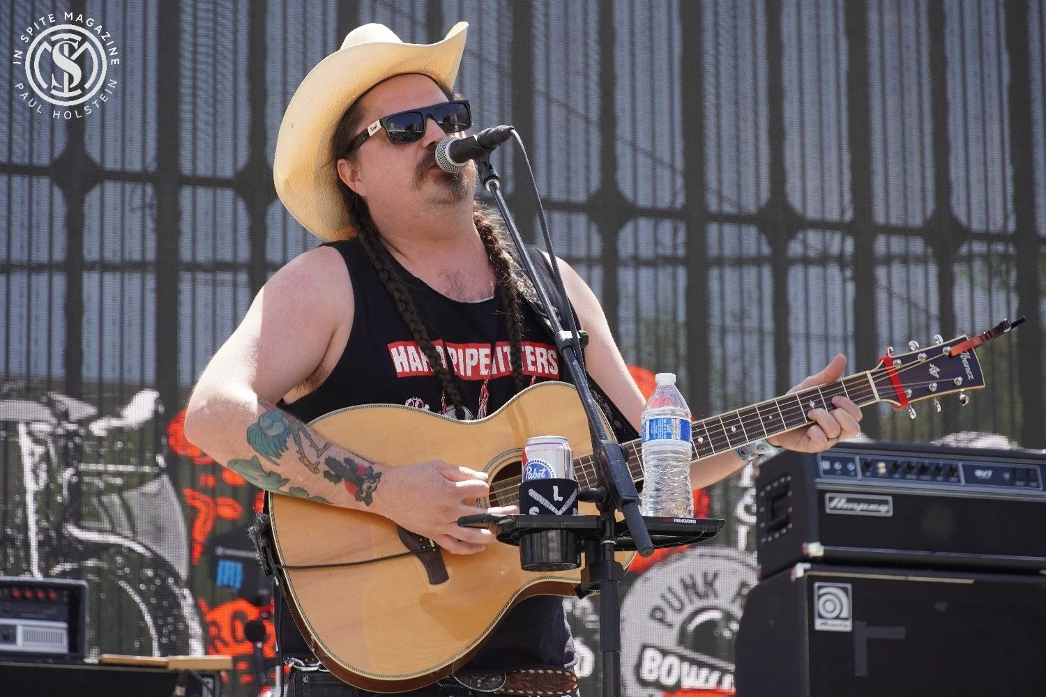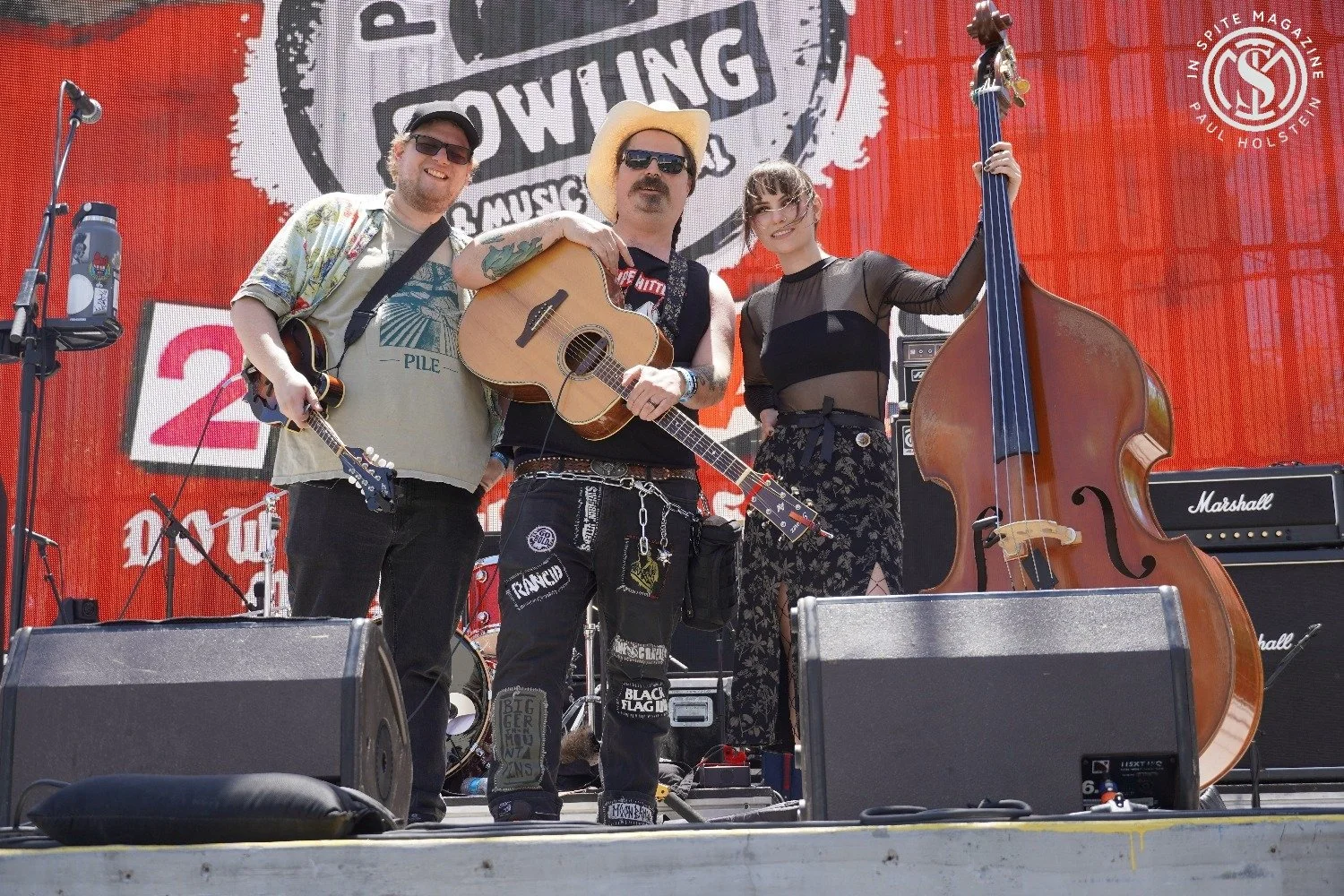 One of the highlights of Punk Rock Bowling this year was hanging in the In-Spite Magazine Spa Tower Suite at The Golden Nugget. The room was two stories with a spiral staircase, overlooking Fremont Street, and it was quite a party at times. Dick Slaughter was bringing bands over to interview, and I walked in Sunday during The Rifleman String Band sitting at the bar and answering questions. I talked to them for a while, but I'll leave it to Dick to publish the full interview. After meeting them, I was especially excited to catch their set on the Main Stage on Monday morning and arrived there promptly following The Briefs/ Modern Action pool party. In fact, I arrived during the sound check (they remembered me and waved as I walked up) and got to take a few posed photos. As expected, their set was great, and it set the stage for an incredible Main Stage lineup that included Angel Du$t, The Bridge City Sinners, The Damned, and Flag. I didn't stay for Social Distortion, but the rest of the staff at In-Spite Magazine were there and will have the full report. As I was leaving the stage after The Riflemen set, I ran into the legendary Nubs, and she was kind enough to pose for a photo.