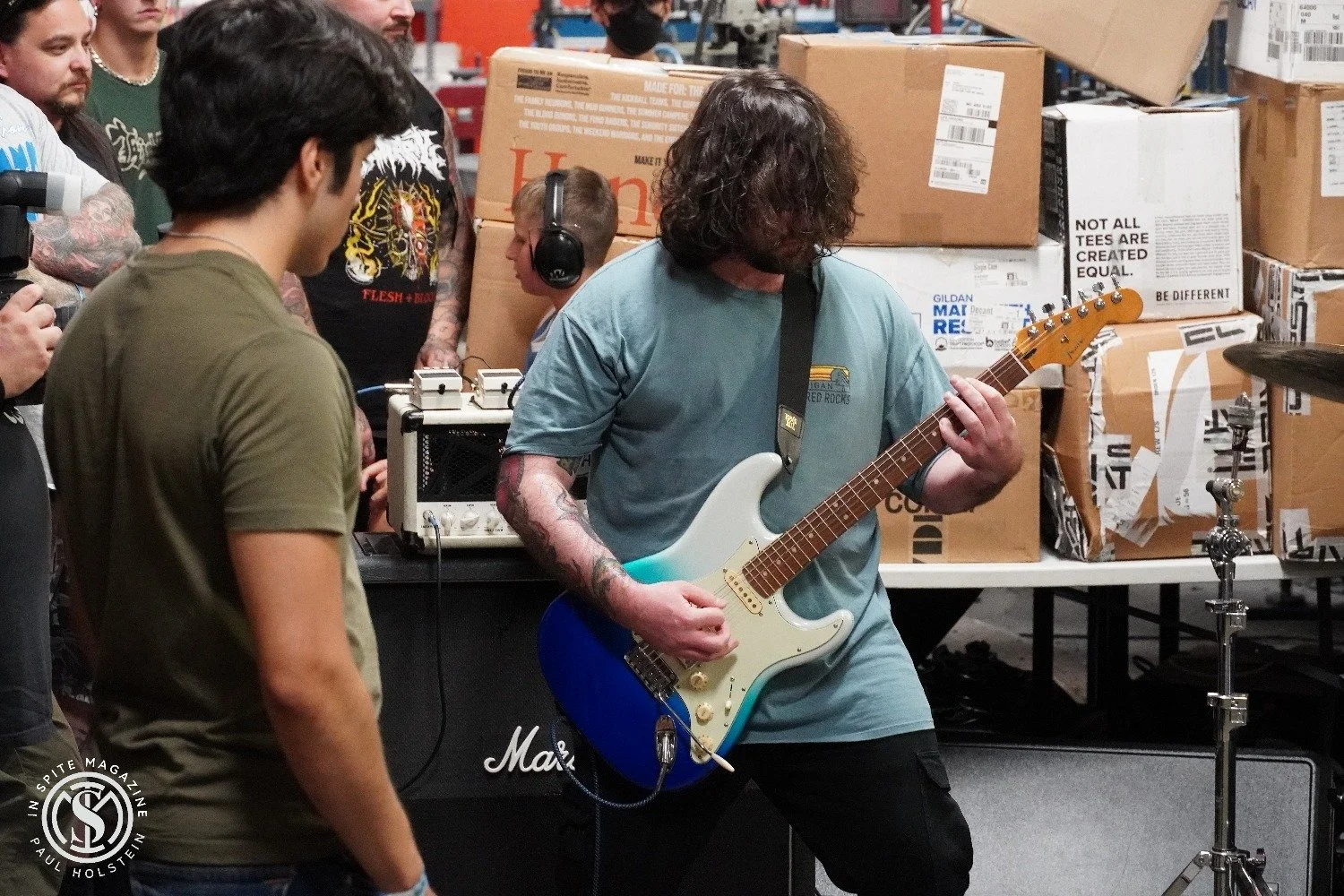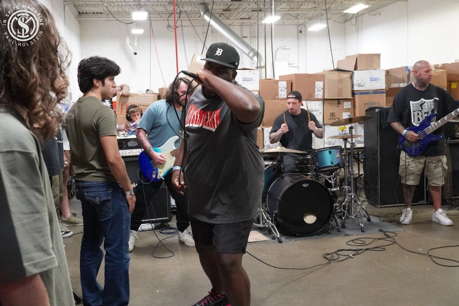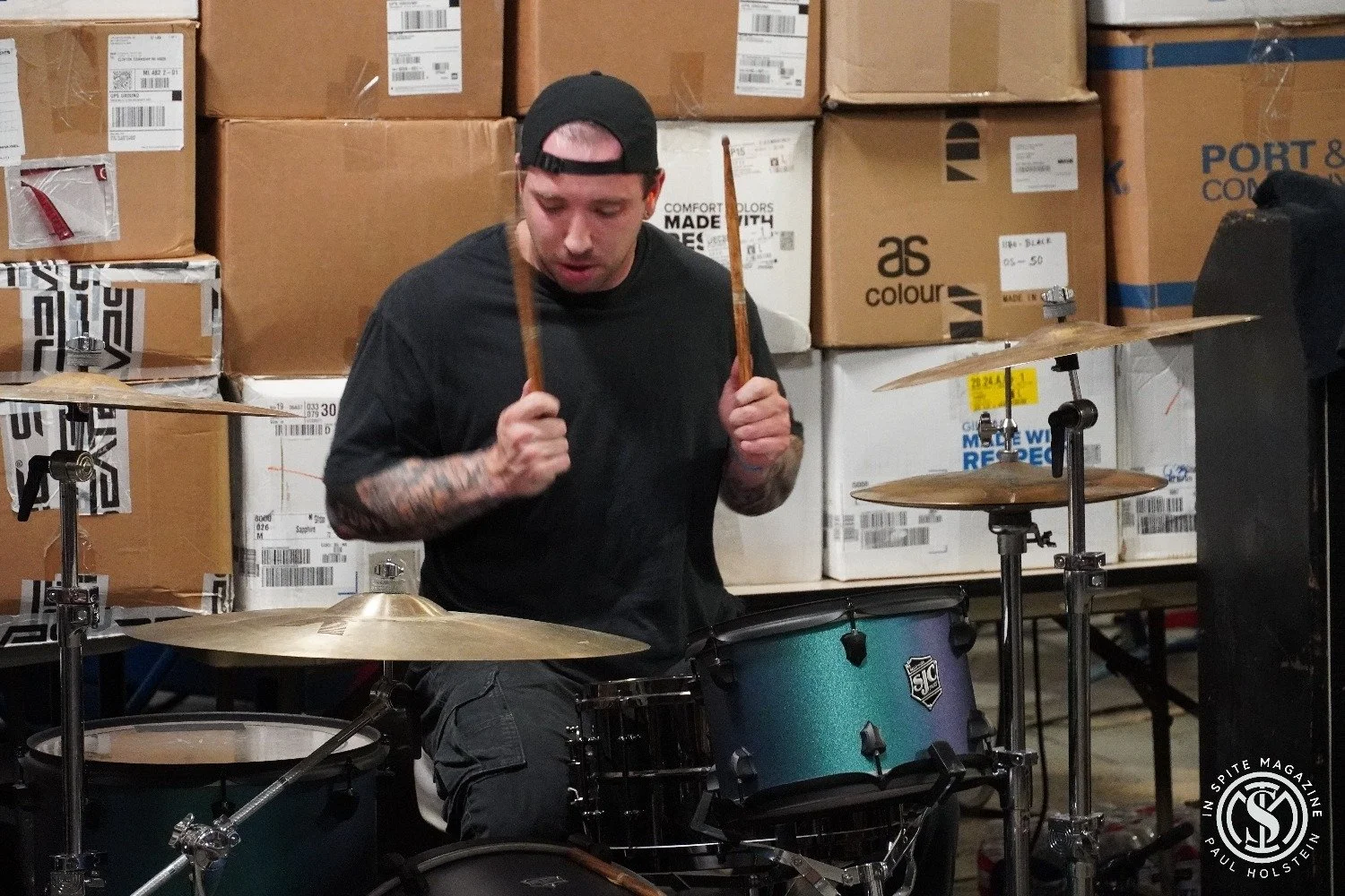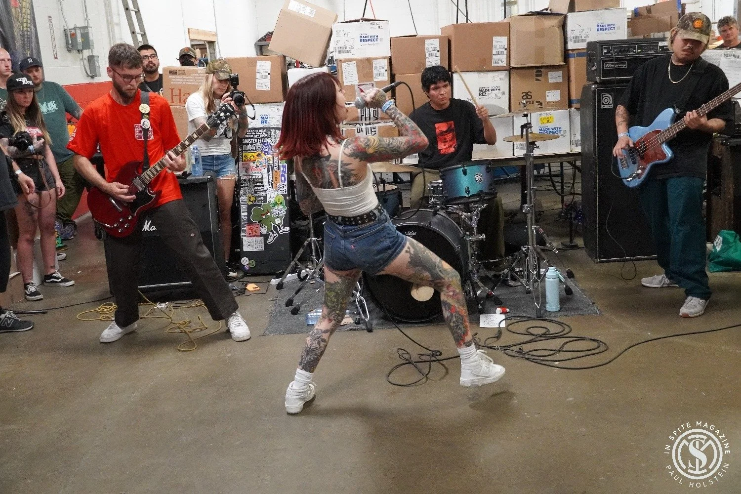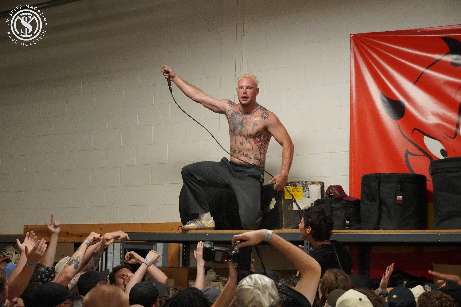 Haywire covered The Cure's "Boys Don't Cry", along with 3 consecutive Hatebreed covers (including "Empty Promises" and "Smash Your Enemies") where Austin took over on guitar and another band member filled in on vocals. But the craziest moment of the show was undoubtedly when Austin climbed up onto one of the large shelving units several feet above the heads of the crowd and did a full flip stage dive. Another incredible show at Edgemen Printing.