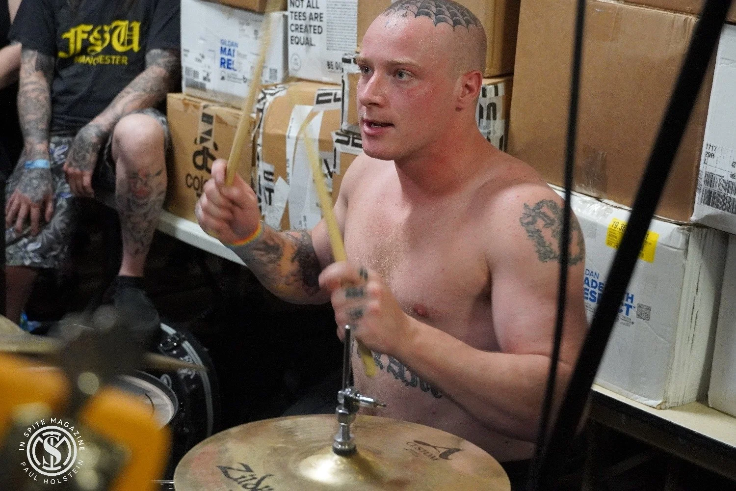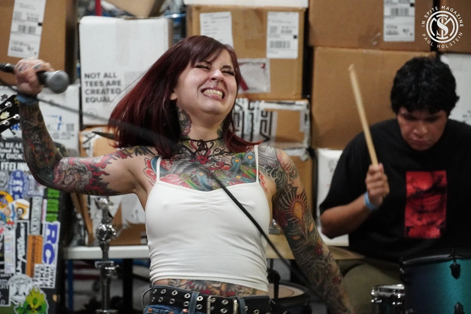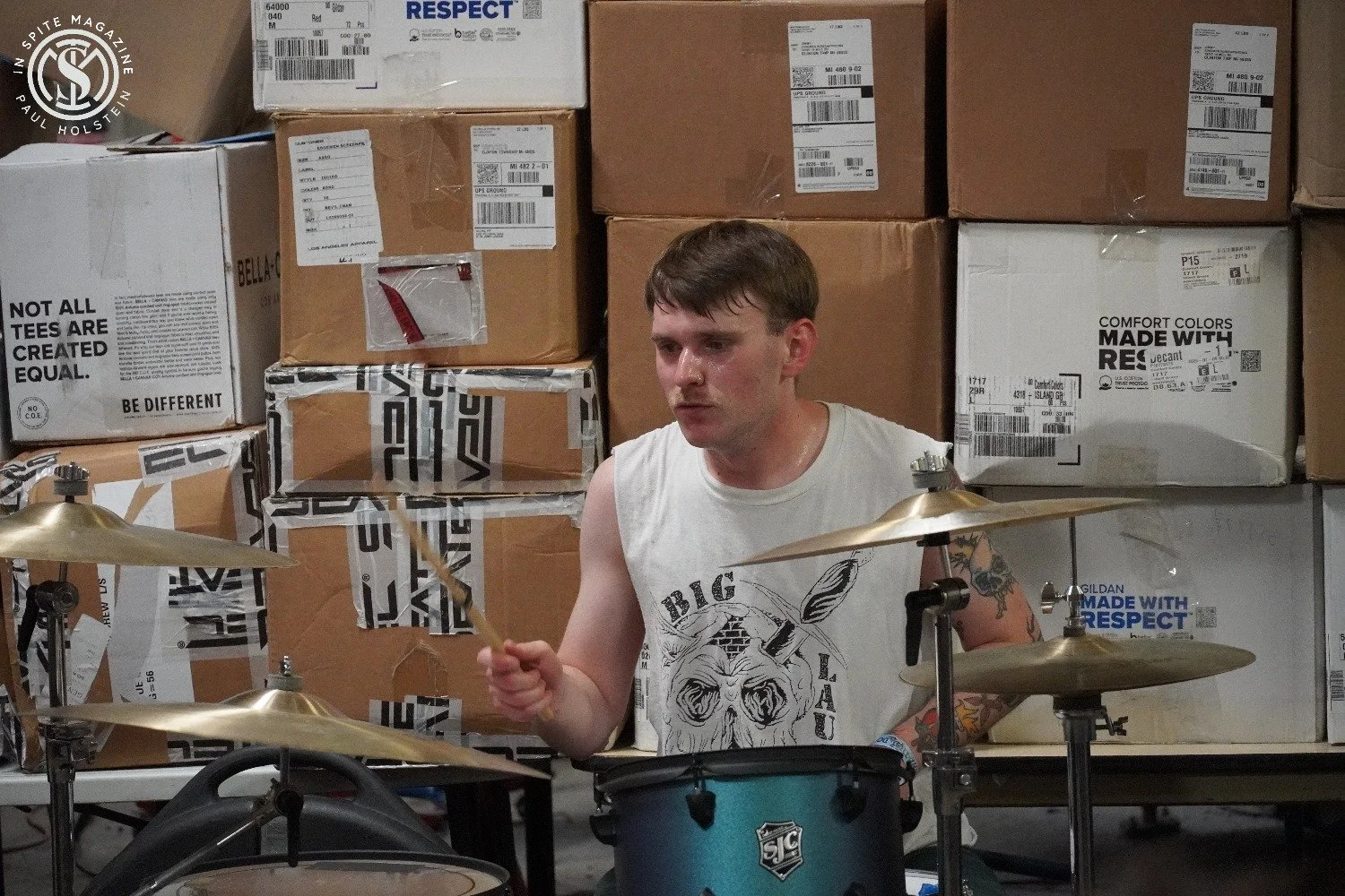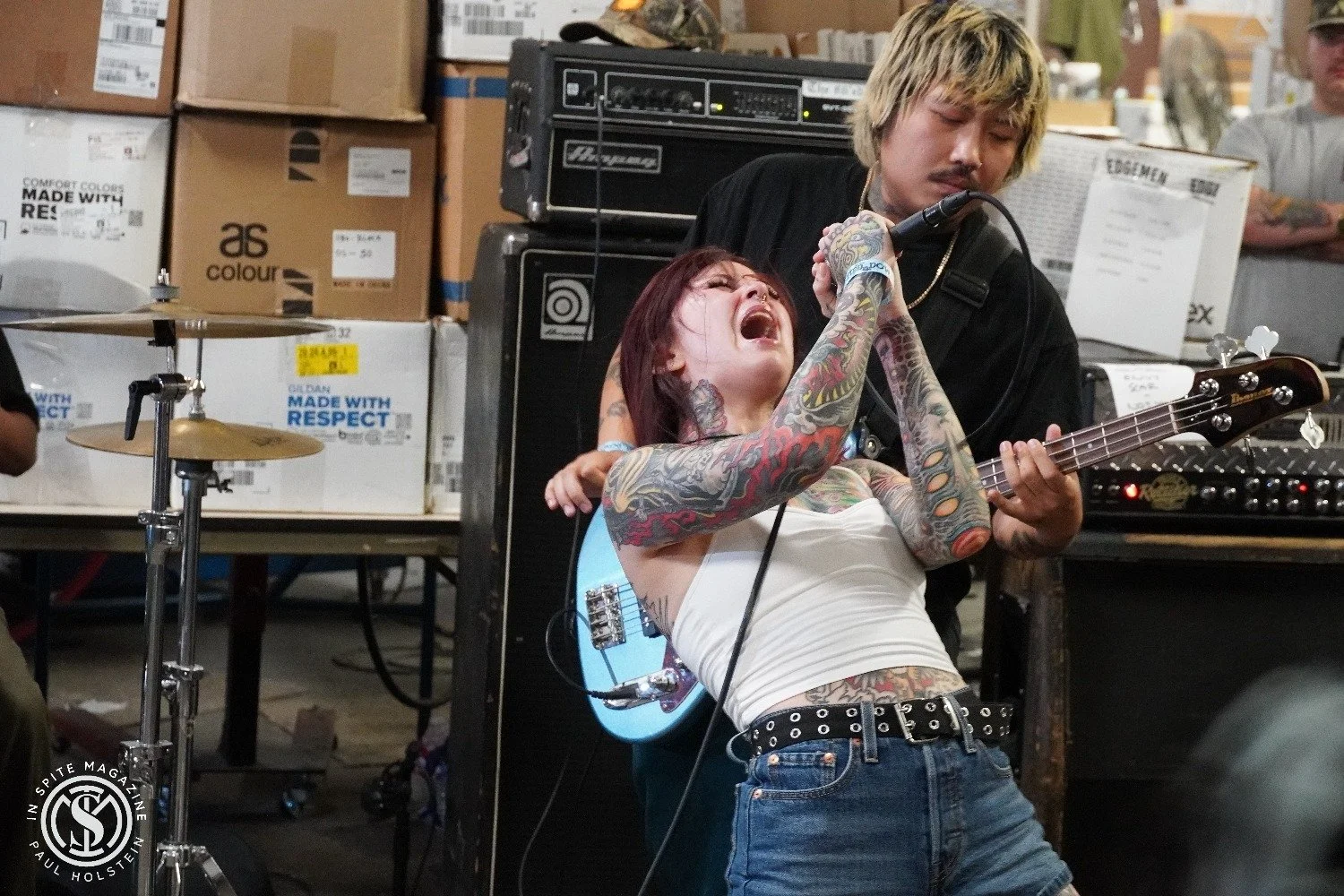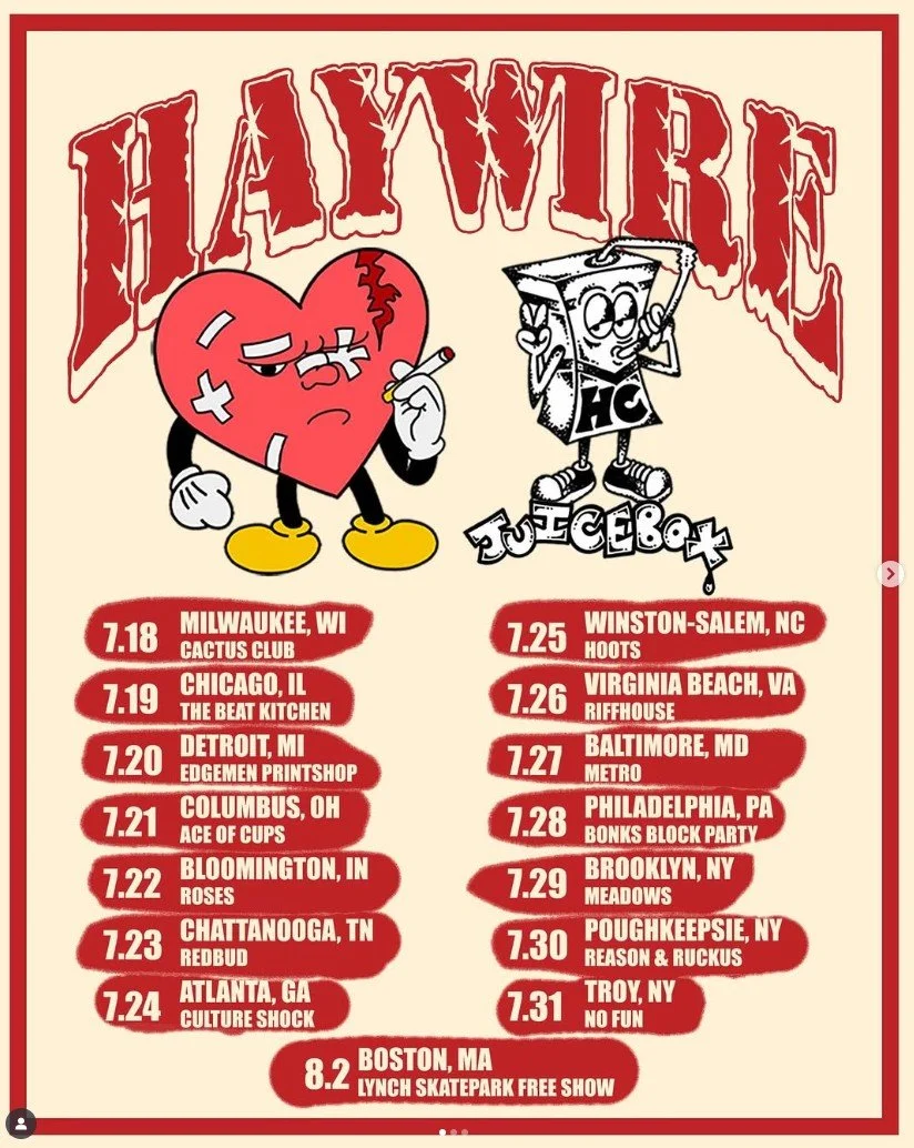Haywire covered The Cure's "Boys Don't Cry", along with 3 consecutive Hatebreed covers (including "Empty Promises" and "Smash Your Enemies") where Austin took over on guitar and another band member filled in on vocals. But the craziest moment of the show was undoubtedly when Austin climbed up onto one of the large shelving units several feet above the heads of the crowd and did a full flip stage dive. Another incredible show at Edgemen Printing.