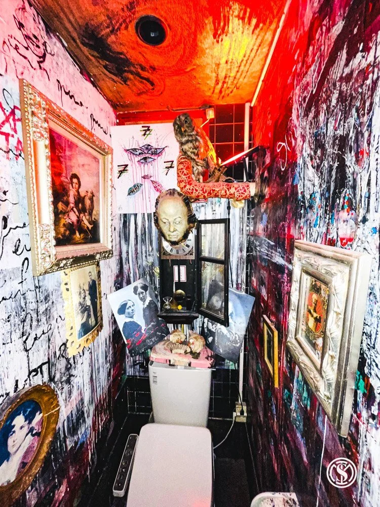 Once you step off the elevator of an otherwise nondescript building, you are confronted with the quirky and unique ambiance of taxidermy and dolls heads that are the signature oddities of the place. This is the realm of KinGuu, a zone named after its owner, a goth cabaret artist with a passion for tango and vintage music. If this place was an album You can easily picture R. Crumb creating the cover art for its vinyl reissue. Now, take the time to process the significant elephant in the room - a colossal camel, dominating the space alongside shibari fetish dolls, other stuffed nightmares, and eccentric paintings. According to the artist, the camel originated from a museum in Nara that went out of business.