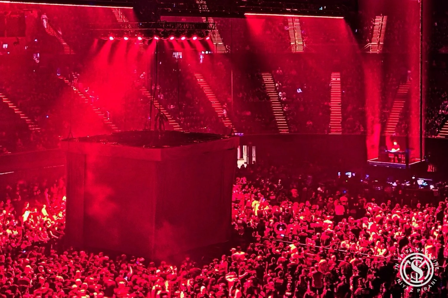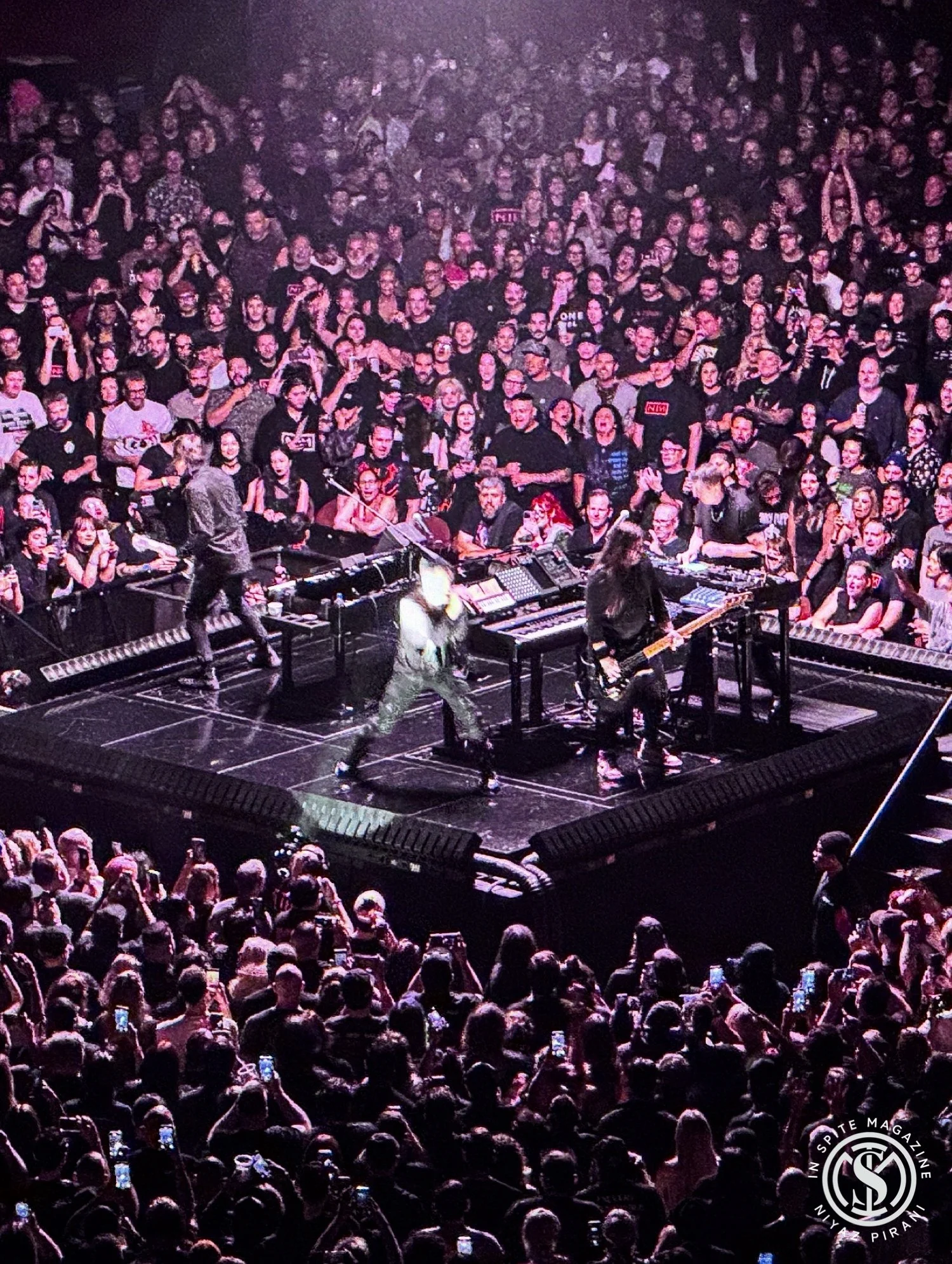 As the lights swirled around the arena, Nine Inch Nails appeared from inside a giant black box positioned in the middle of the arena to kick off their show. Starting and ending the show with two poignant, minimal piano-driven pieces (“Right Where It Belongs” and “Hurt”), everything sandwiched in between would become a feast for the senses.