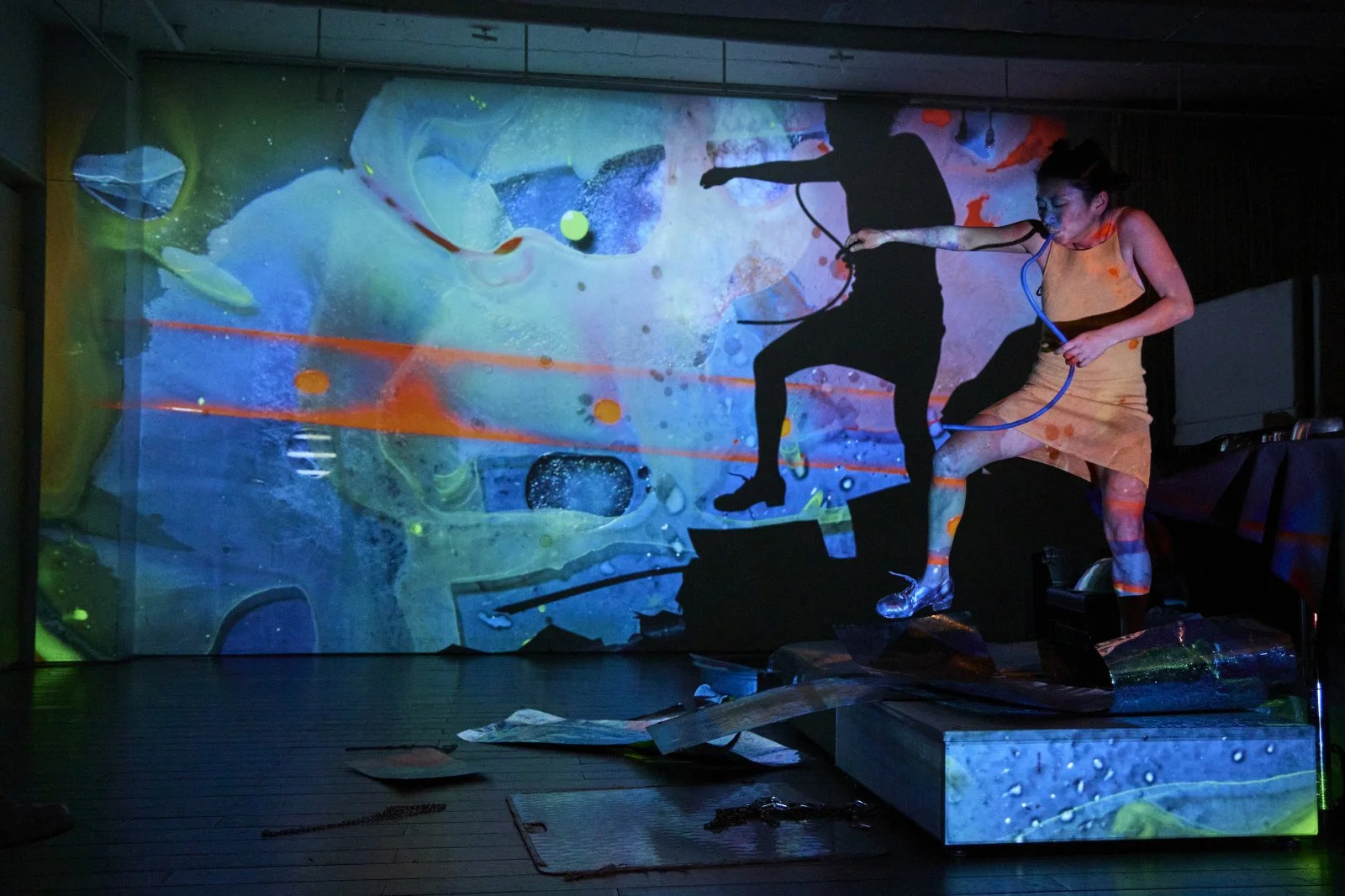 We were greeted with the detritus of 25 years of artistic collaboration, cultural obsession, and family. Eden was born with Joubert syndrome, a particularly rare brain disorder manifesting itself through physical, mental and visual impairments. Nonetheless, she trained as a visual artist, and her work has been shown across the UK, notably at Tate Modern. She has also been something of a muse for her father, casting her from an early age. The remnants of all this work, including visual art, film projections, costumes, giant inflatable effigies of her grandparents, and shelves full of trinkets, fills the gallery.